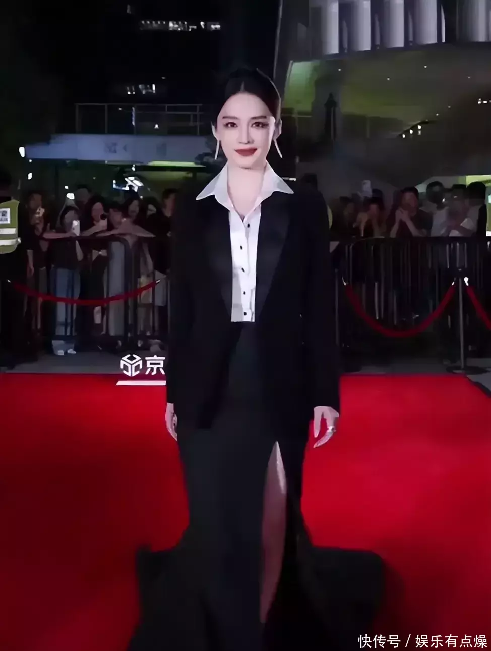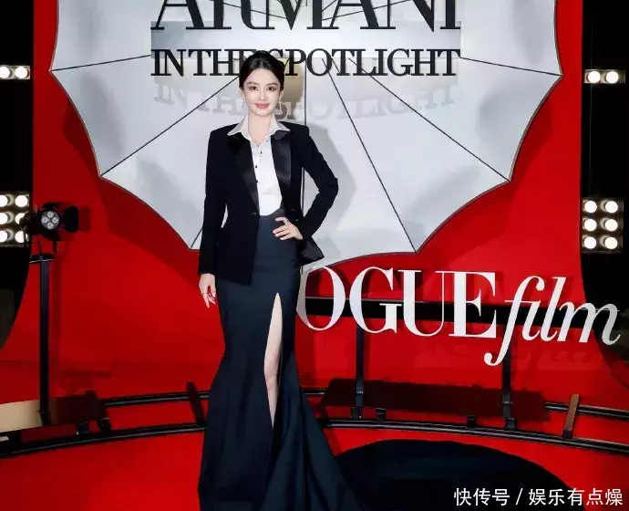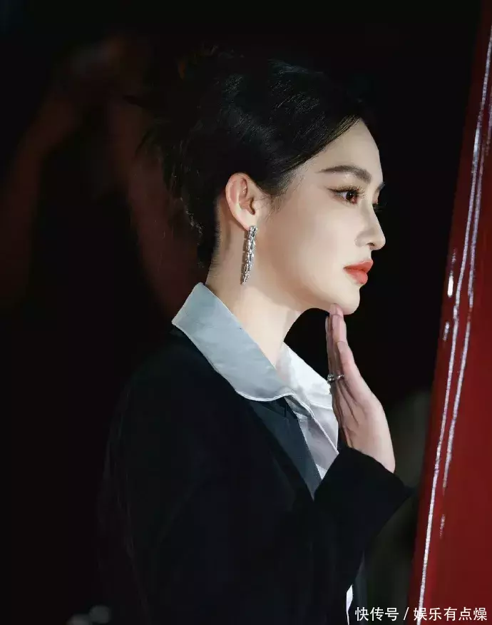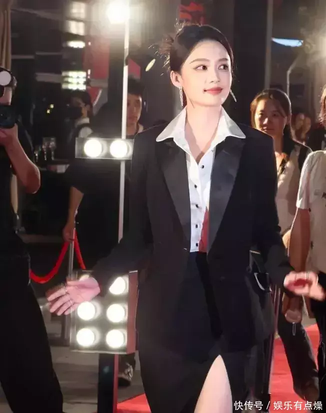 这套造型可谓是帅气与优雅的完美结合:上半身西装剪裁利落,充满干练气质;下半身鱼尾裙微微收束,优雅又带着性感。黑色丝绒在灯光下泛着低调光泽,让她整个人散发出成熟女性的权威感。走路带风、步伐稳健,她的每一个动作都像是在签下重要合同般自信满满,粉丝们亲切地喊她“老公姐”,称号既俏皮又贴近人心,瞬间拉近了明星与观众的距离。